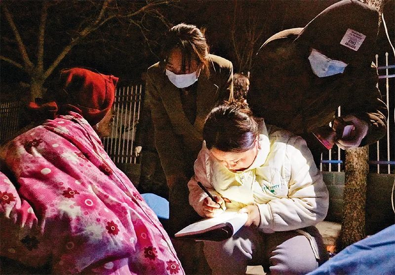2023年12月19日,在甘肅省積石山縣中西醫結合醫院門口,當地干部在登記受災群眾信息。18日23時59分,甘肅省臨夏回族自治州積石山保安族東鄉族撒拉族自治縣發生6.2級地震。(新華社記者?馬希平/攝)