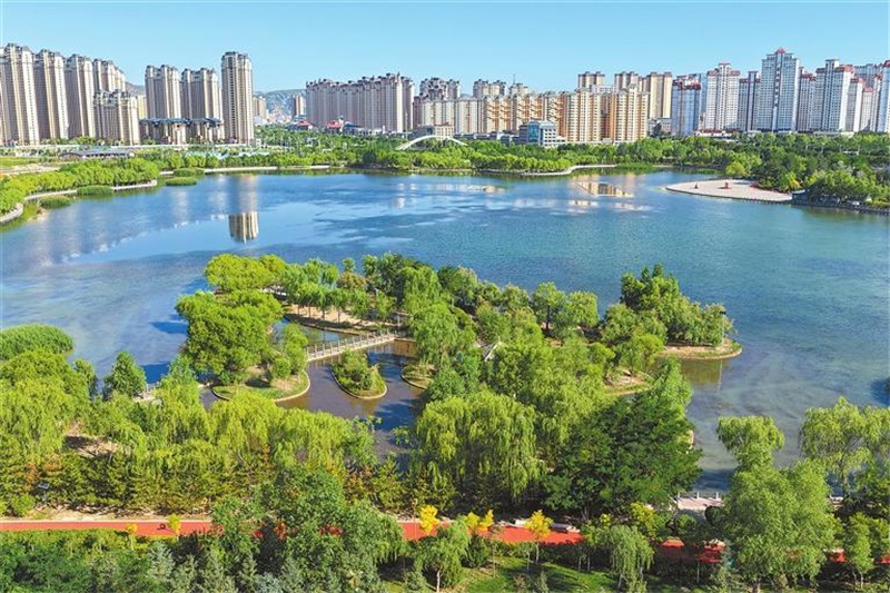 依托引洮工程建成的定西湖公園綠植環(huán)繞,水面清澈如鏡。(本版圖片攝影:記者郁婕 丁凱)