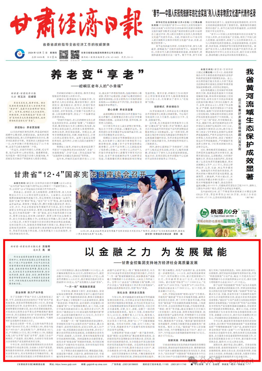 作為全省國有金融資本投資、融資和管理中心,甘肅金控集團認真貫徹落實黨的二十屆三中全會精神、習近平總書記在甘肅考察時的重要講話重要指示精神及省委、省政府各項決策部署,聚焦主責主業,充分依靠多業務板塊協同優勢,綜合運用證券、投資、基金、征信、融資租賃和要素市場等金融手段,不斷提升自身業務水平,不斷為隴原大地經濟社會高質量發展貢獻力量。