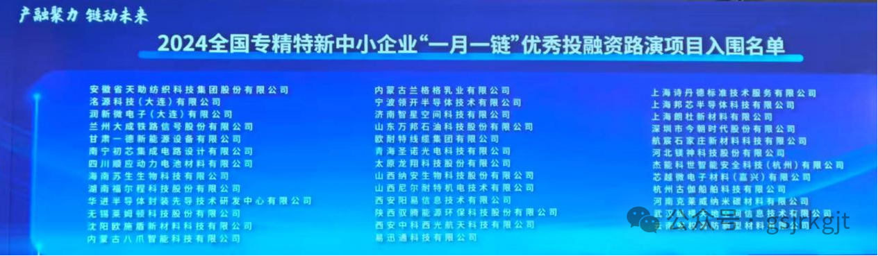 近日,“一月一鏈” 中小企業(yè)融資促進全國行上海站活動開啟。全國 6 家專精特新中小企業(yè)在活動中進行了項目路演推介,其中甘肅股權交易中心“專精特新專板”掛牌企業(yè)蘭州大成鐵路信號股份有限公司和甘肅一德新能源設備有限公司成功入圍 2024 年全國專精特新中小企業(yè) “一月一鏈” 優(yōu)秀投融資路演項目。